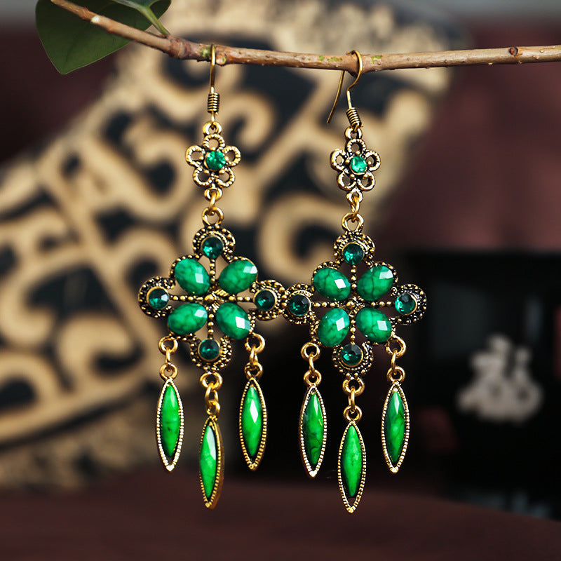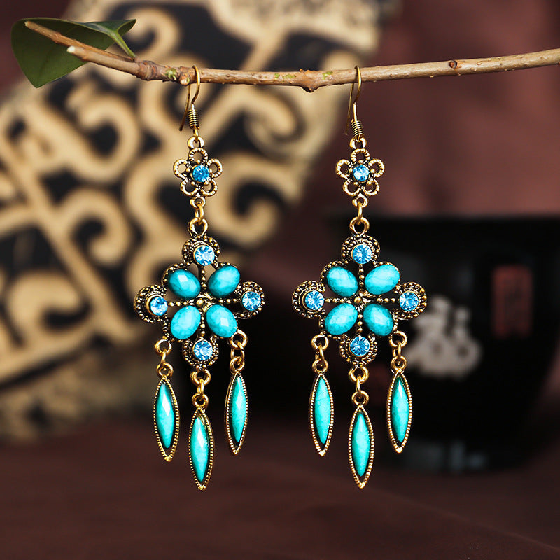 New vintage ethnic accessories diamond-shaped hole blue cutout long fringed earrings with women's diamond-set alloy earrings