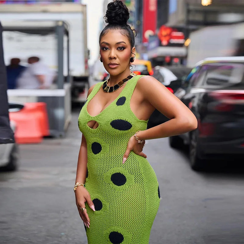 Featuring a daring see-through design, this dress adds a touch of mystery and allure.
