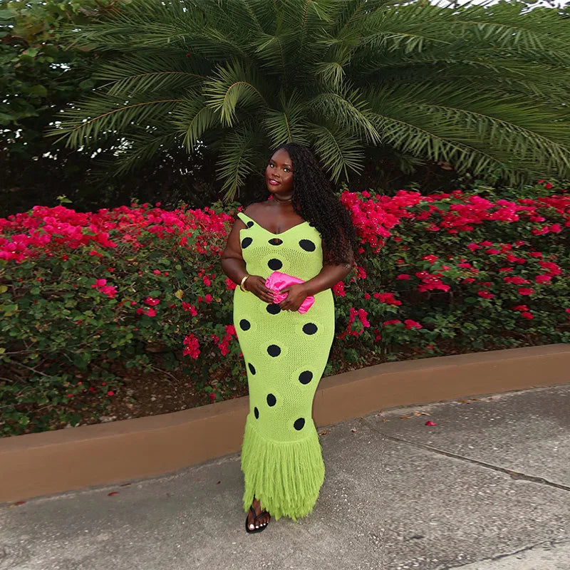 Women Sexy See Through Knitted Maxi Dress Hollow Out Deep Neck Pot Robes Tassel Hem Fork Party Vestidos 2025 New Lady Club Dress