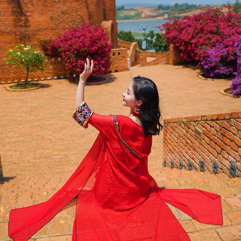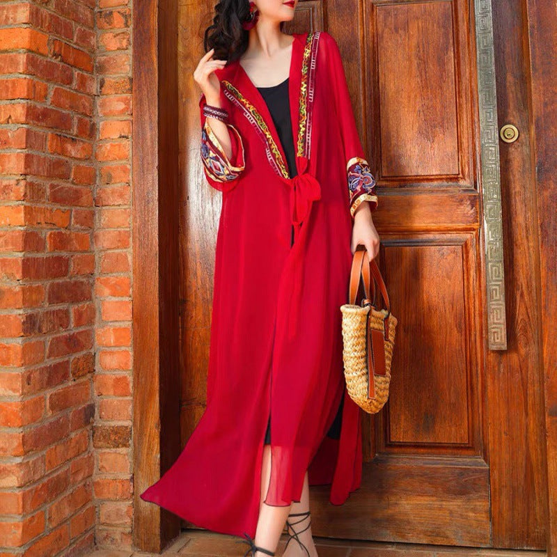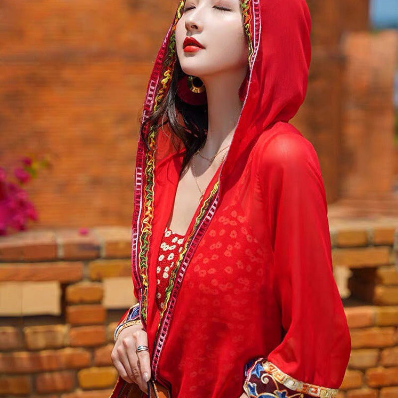 Ethnic style sunscreen cardigan women's thin desert hooded jacket embroidered retro chiffon beach blouse loose outsideSize     Length           Bust